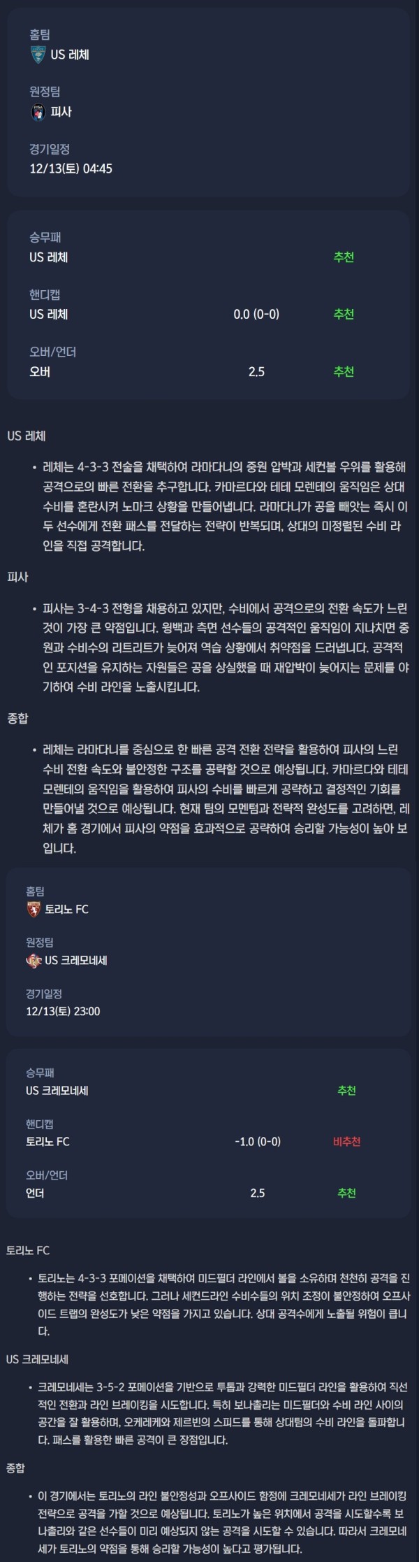 2025년 12월 13일 세리에A 분석자료 / 축구분석