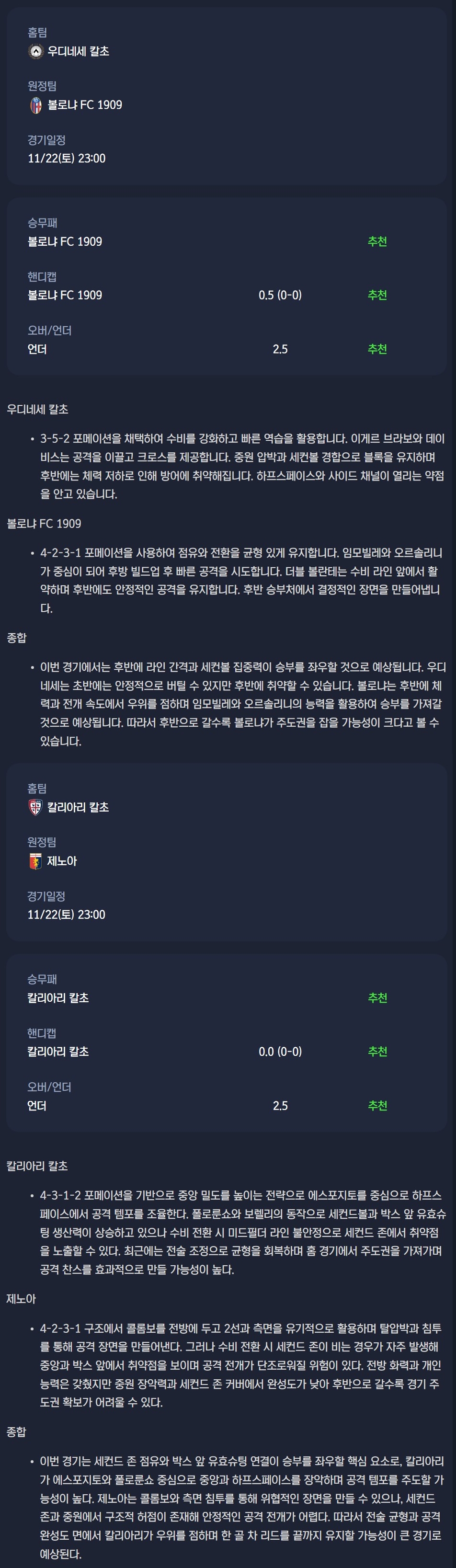 2025년 11월 22일 세리에A 분석차료 / 축구분석