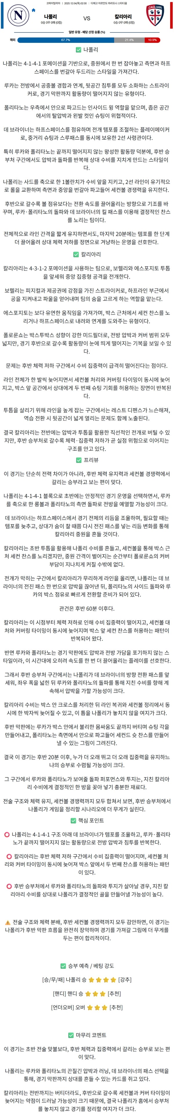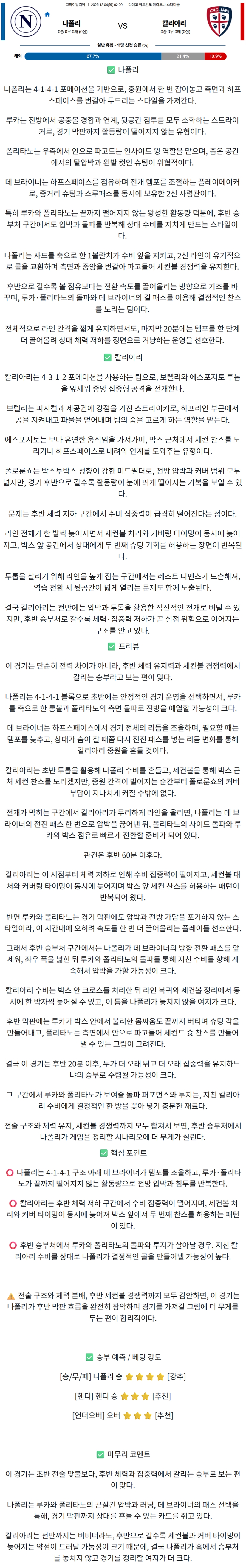 2025년 12월 04일 SSC 나폴리 vs 칼리아리 코파이탈리아 분석자료 / 축구분석