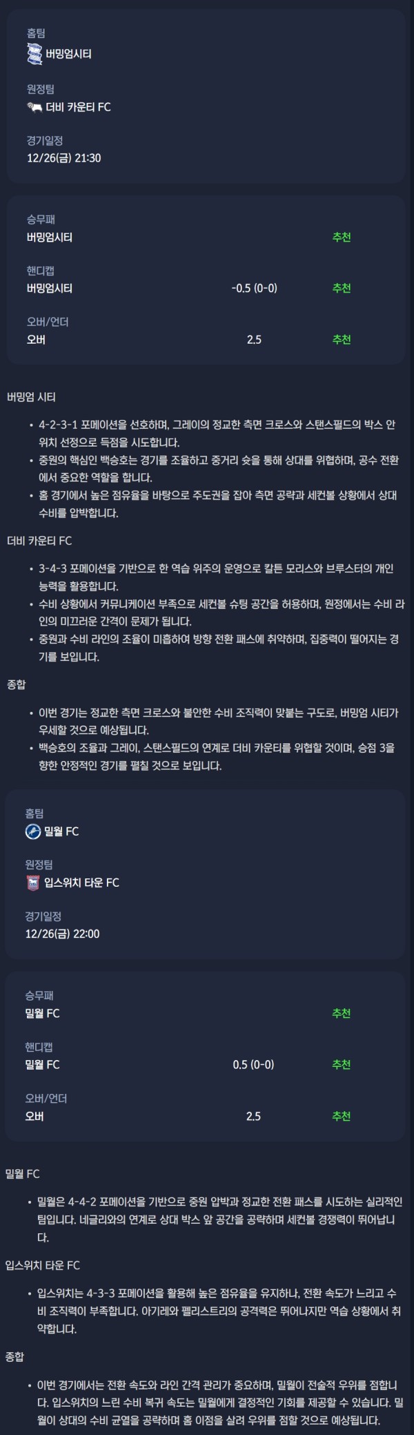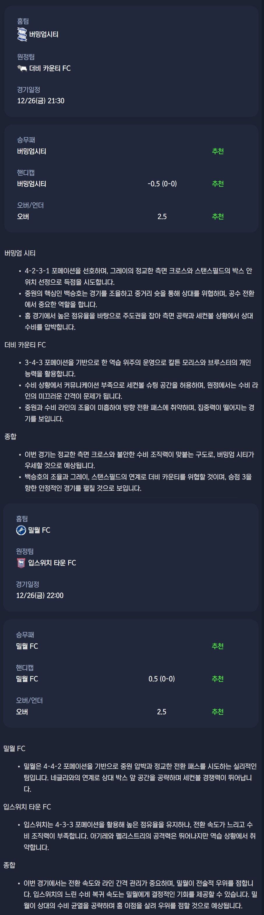 2025년 12월 26일 EFL챔피언십 분석자료 / 축구분석