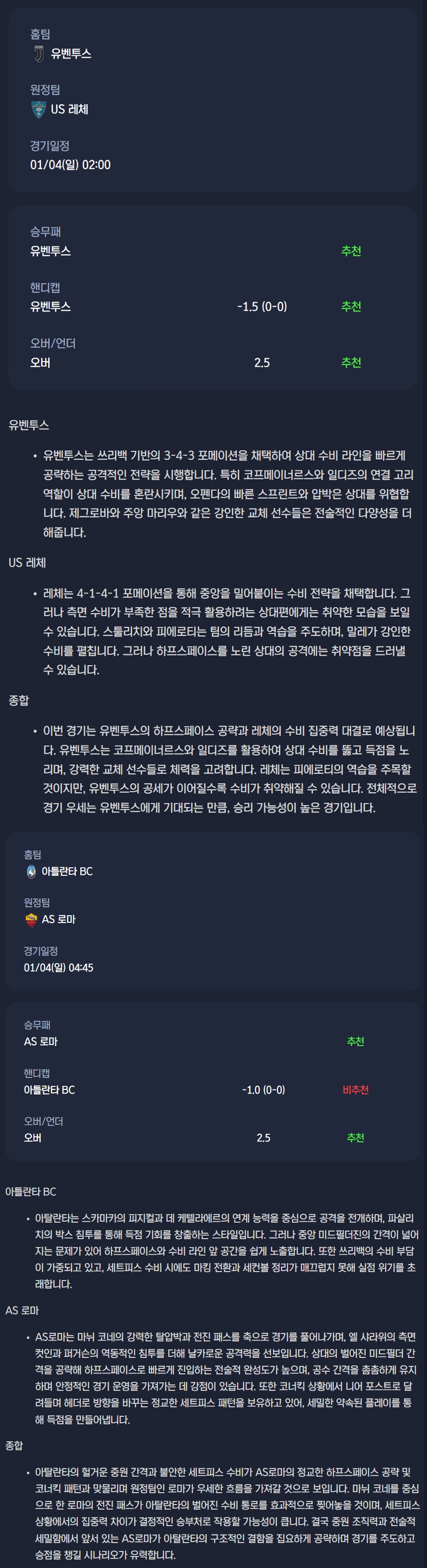 2026년 01월 04일 세리에A 분석자료 / 축구분석