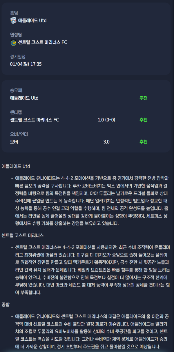 2026년 01월 04일 A리그 분석자료 / 축구분석