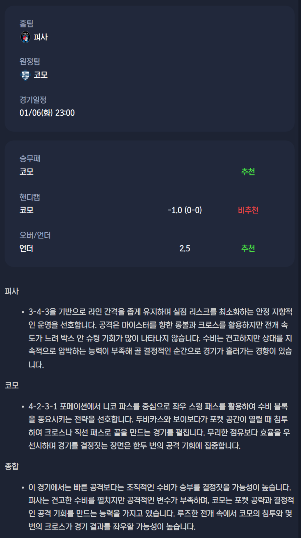 2026년 01월 06일 세리에A 분석자료 / 축구분석