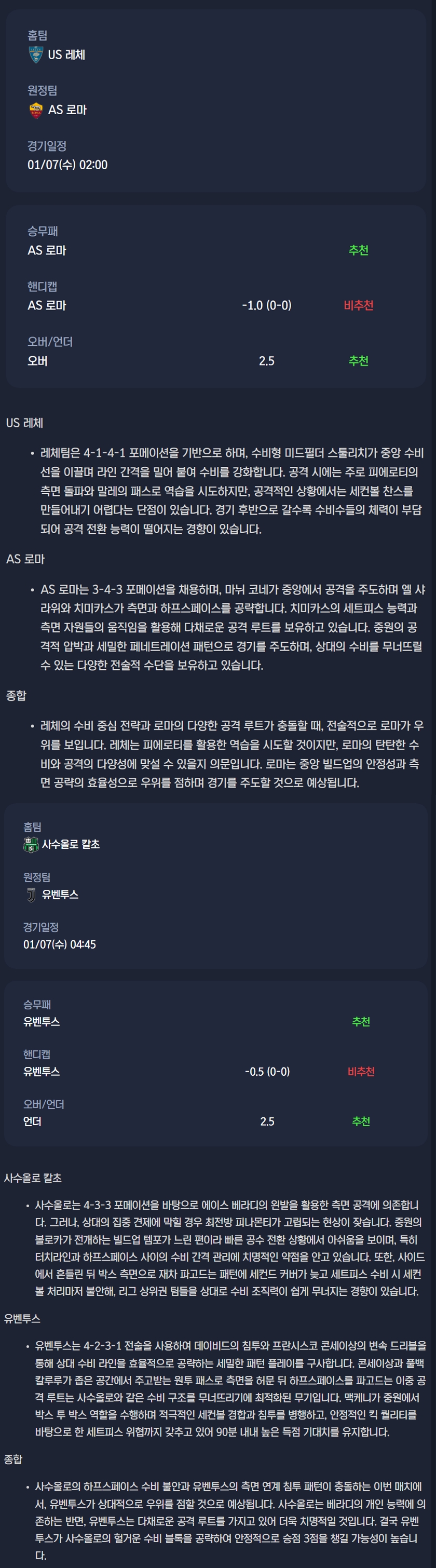 2026년 01월 07일 세리에A 분석자료 / 축구분석
