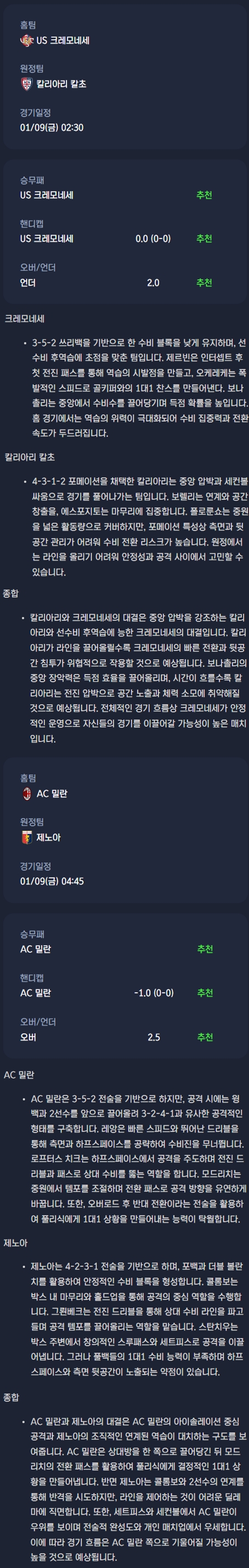 2026년 01월 09일 세리에A 분석자료 / 축구분석