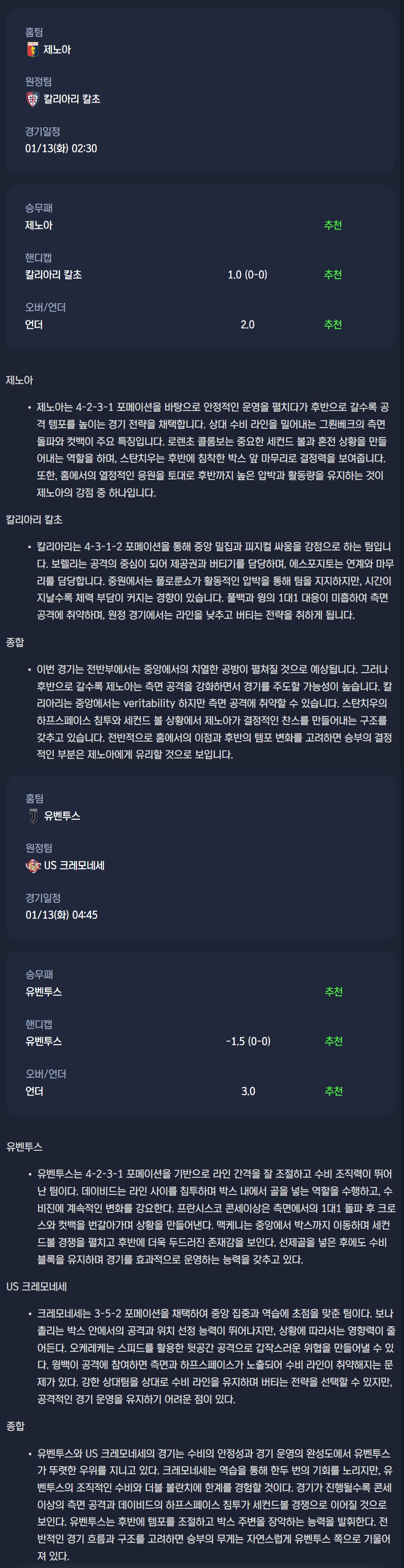 제노아 vs 칼리아리 칼초 / 유벤투스 vs US 크레모네세