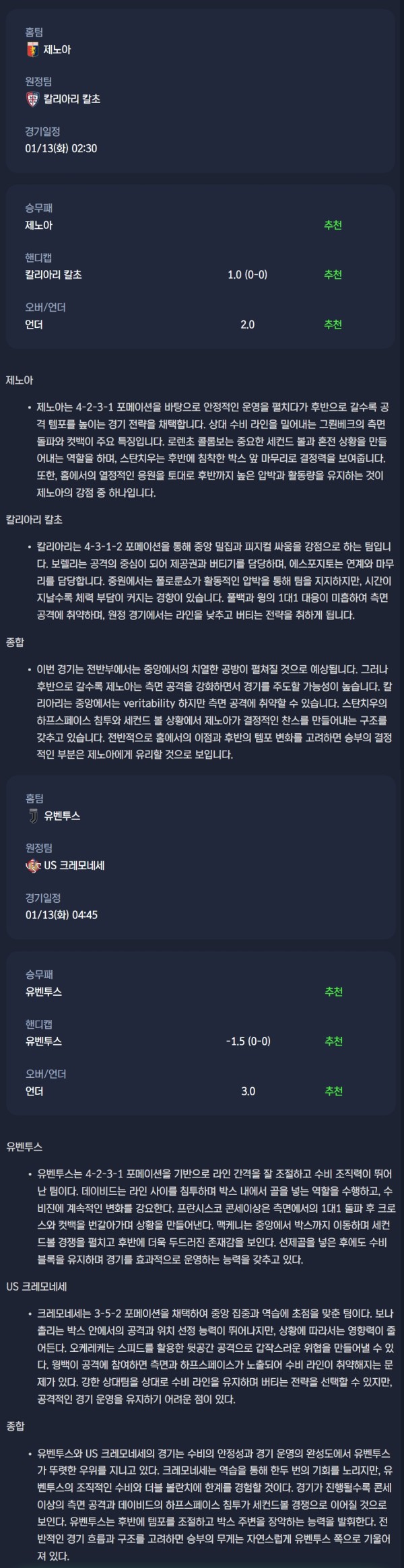 2026년 01월 13일 세리에A 분석자료 / 축구분석