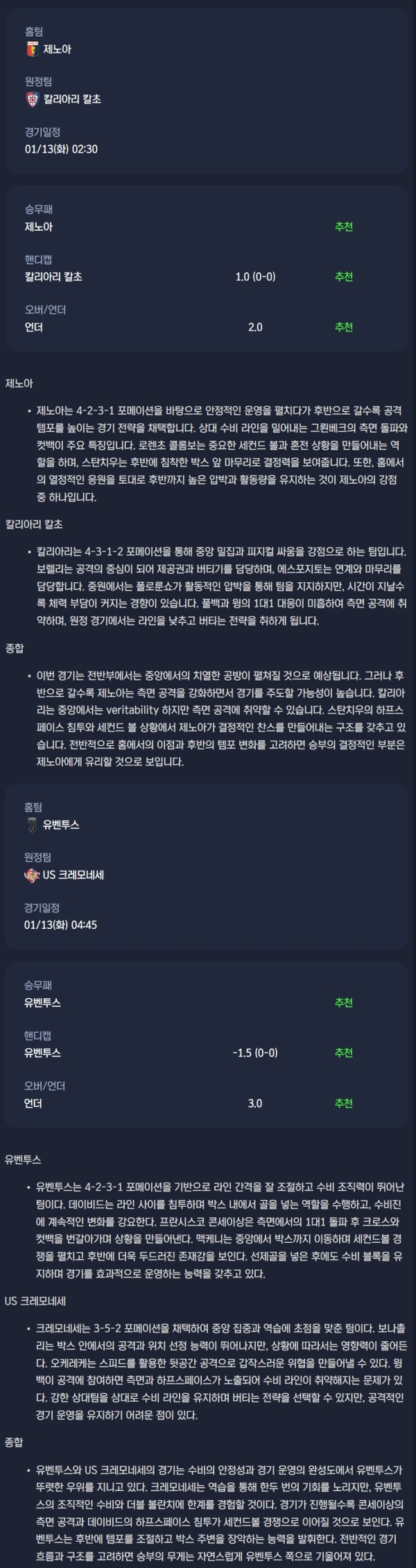 2026년 01월 13일 세리에A 분석자료 / 축구분석