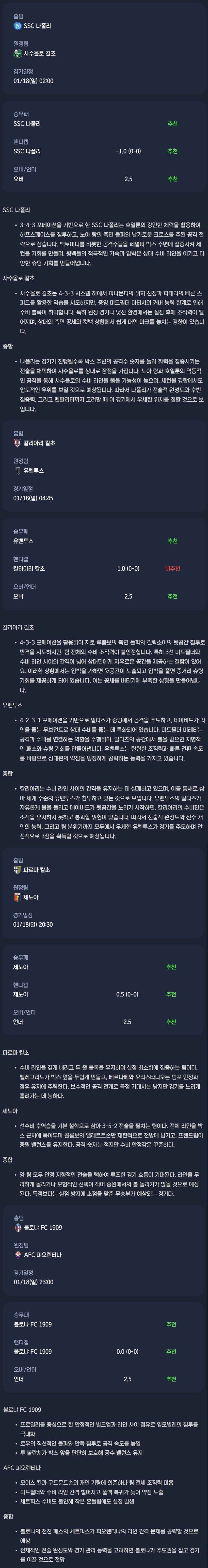 2026년 01월 18일 세리에A 분석자료 / 축구분석