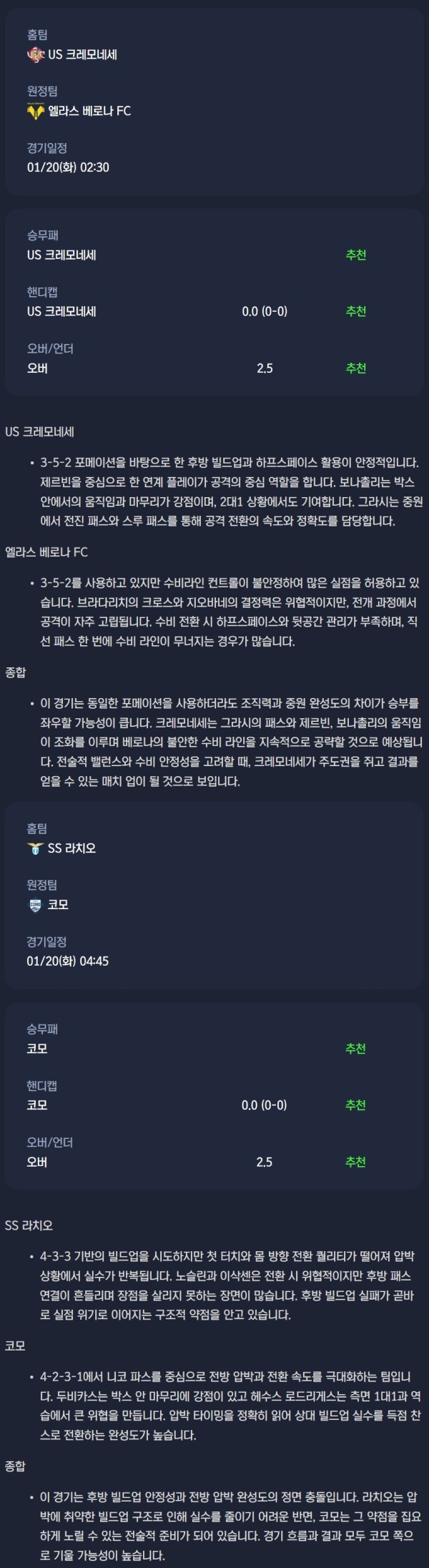 2026년 01월 20일 세리에A 분석자료 / 축구분석