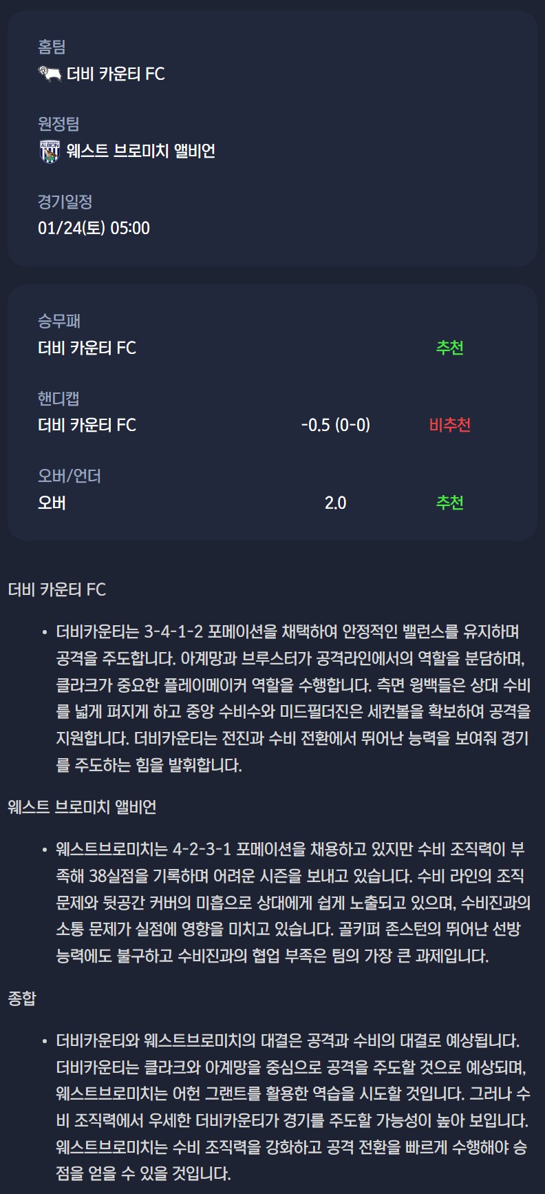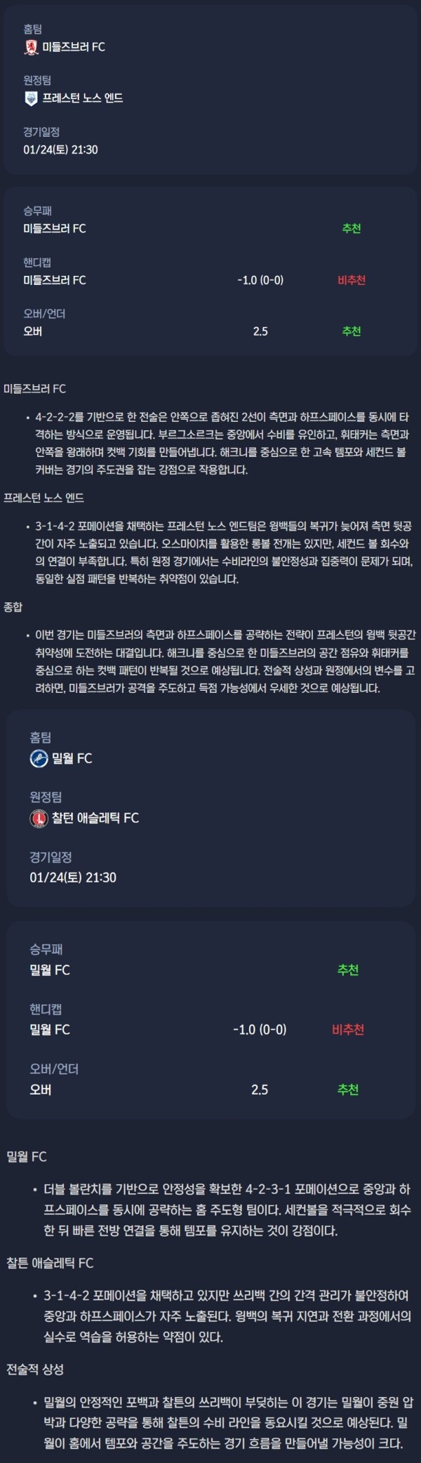 2026년 01월 24일 EFL챔피언십 분석자료 / 축구분석