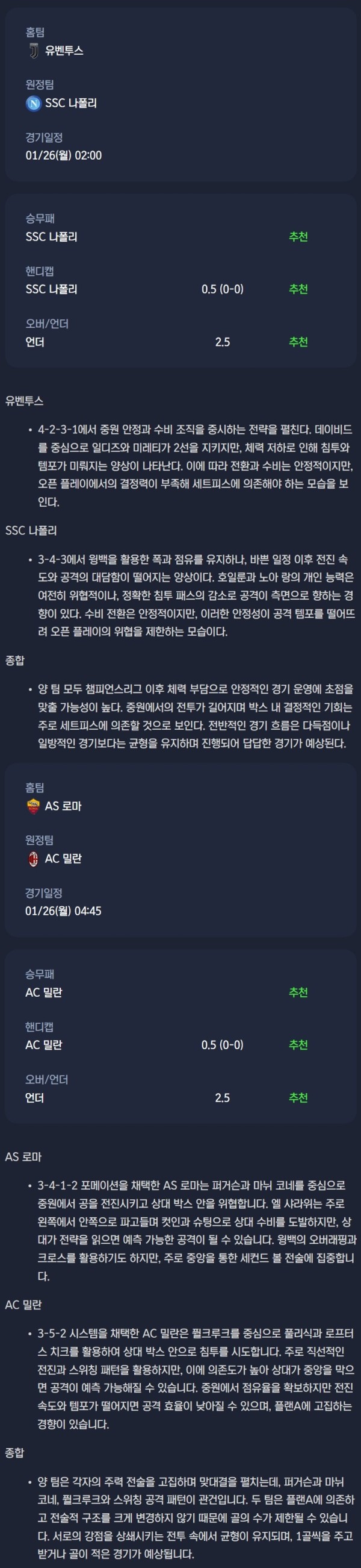 2026년 01월 25일 세리에A 분석자료 / 축구분석