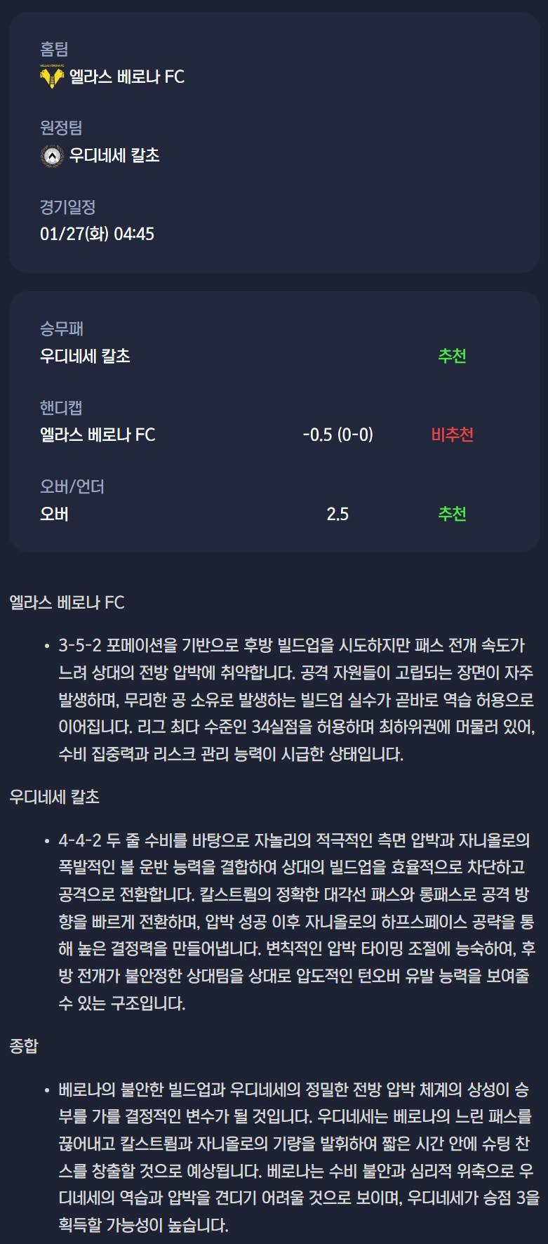 2026년 01월 27일 세리에A 분석자료 / 축구분석