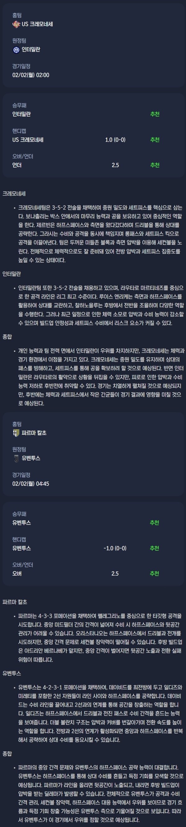 2026년 02월 02일 세리에A 분석자료 / 축구분석