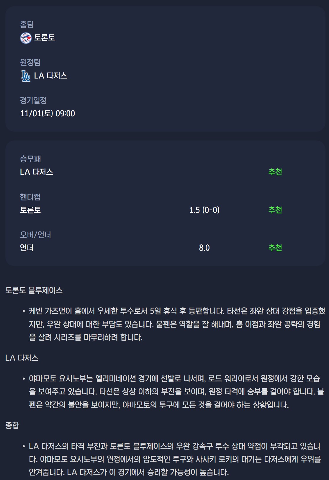 2025-11-01 MLB 분석자료 스포츠 무료중계 / 스포츠 중계