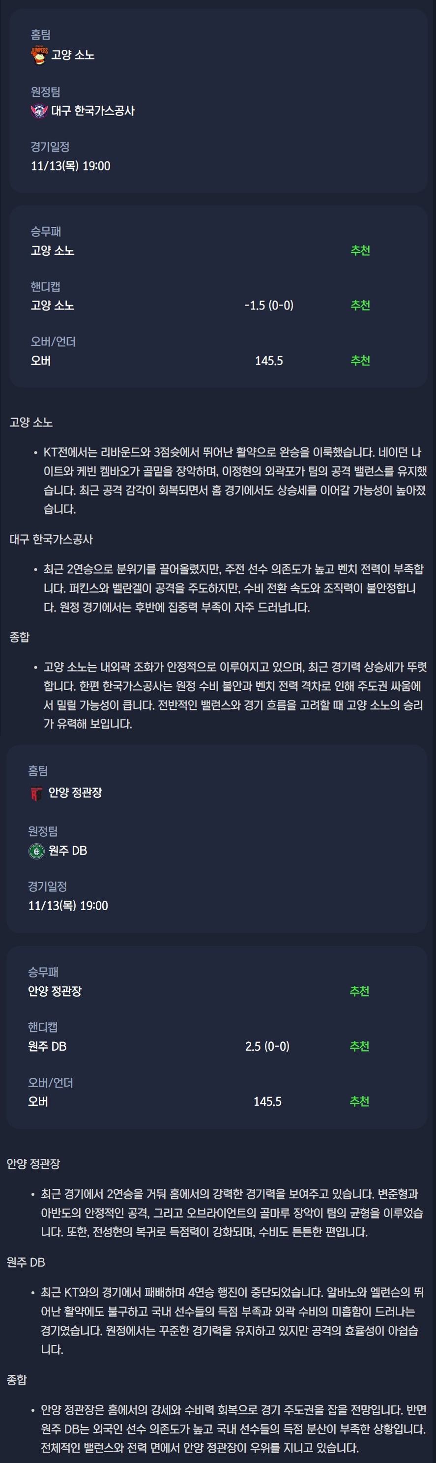2025-11-13 국내농구 KBL 분석자료 스포츠 무료중계 / 스포츠 중계