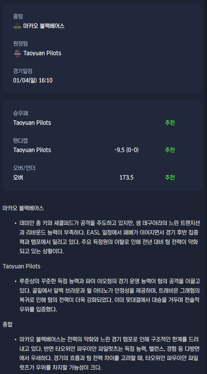 마카오 블랙베어스 vs Taoyuan Pilots