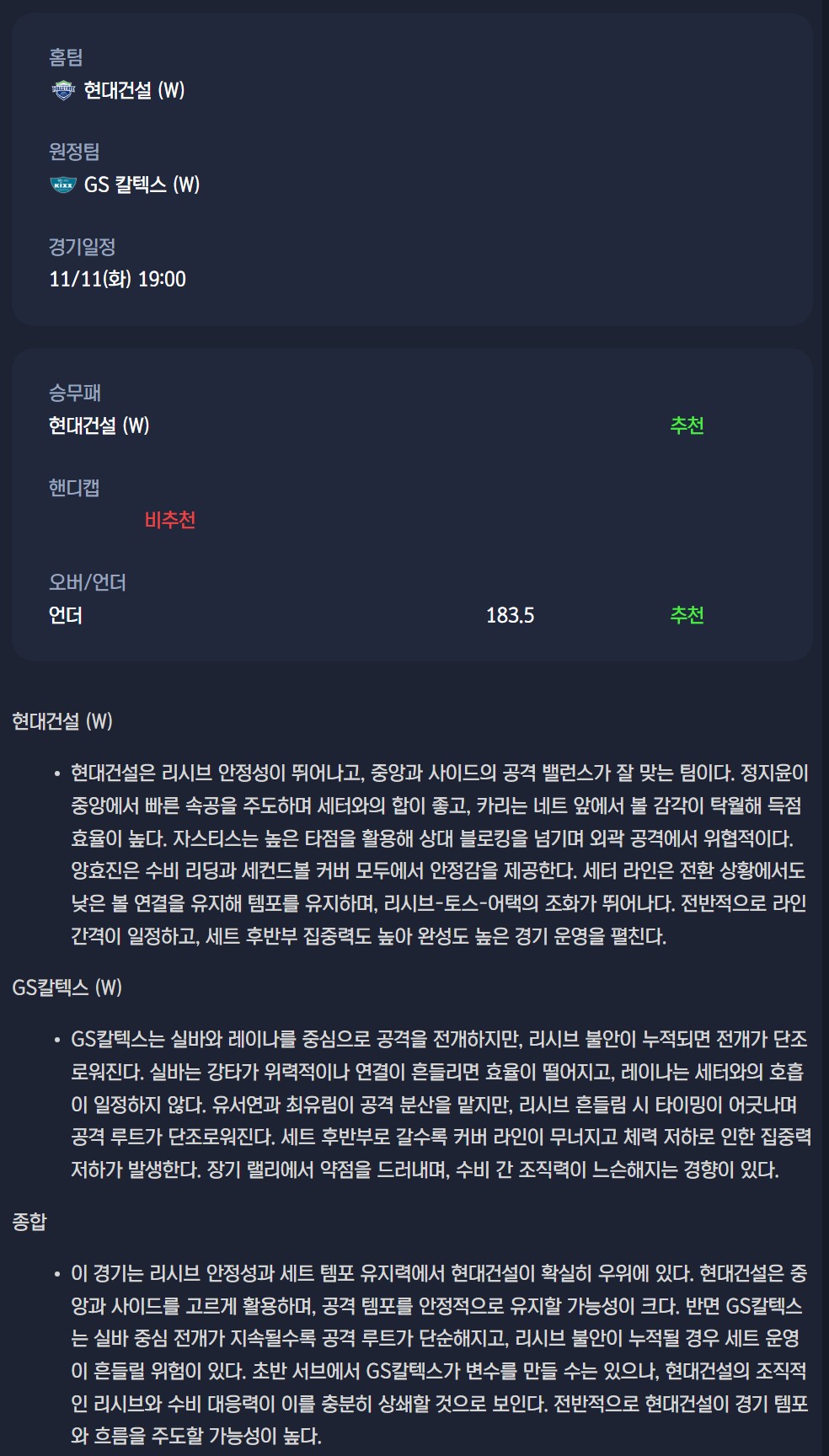 2025-11-11 현대건설 vs GS 칼텍스 여자배구 분석자료 스포츠 무료중계 / 스포츠 중계