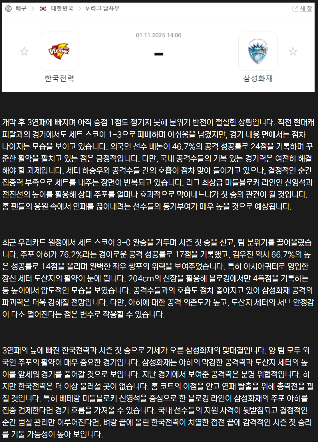 2025-11-01 V-리그 남자배구 분석자료 스포츠 무료중계 / 스포츠 중계