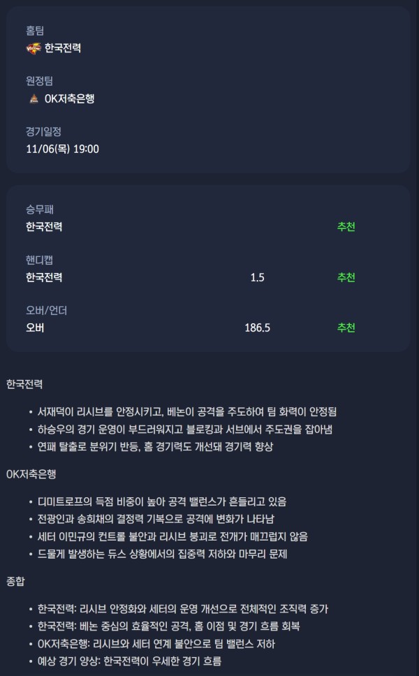 2025-11-06 한국전력 vs OK저축은행 남자배구 분석자료 스포츠 무료중계 / 스포츠 중계