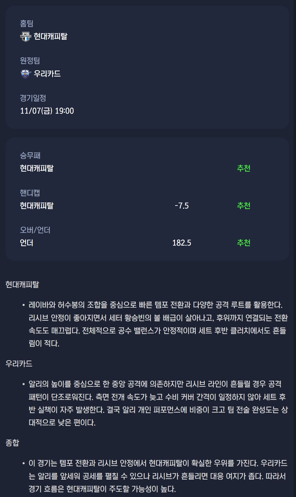 2025-11-07 현대캐피탈 vs 우리카드 남자배구 분석자료 스포츠 무료중계 / 스포츠 중계