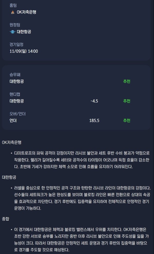 2025-11-09 OK저축은행 vs 대한항공 남자배구 분석자료 스포츠 무료중계 / 스포츠 중계