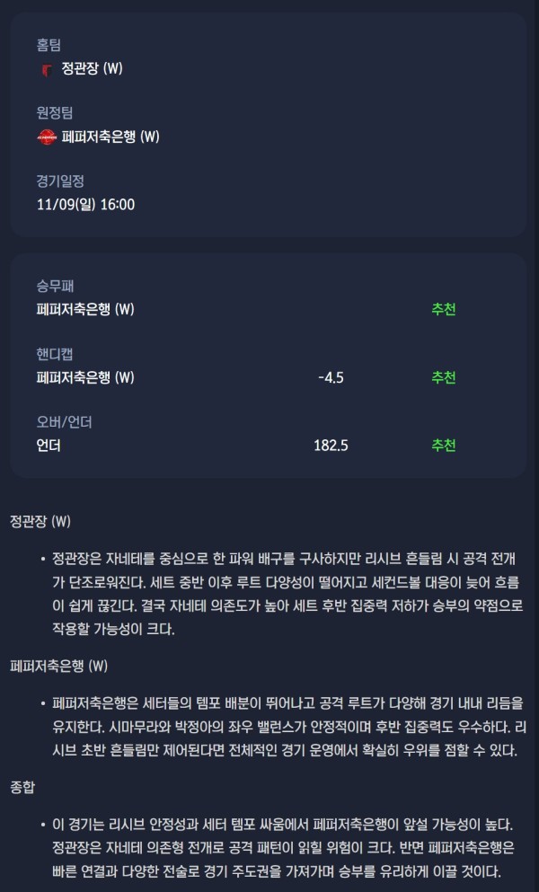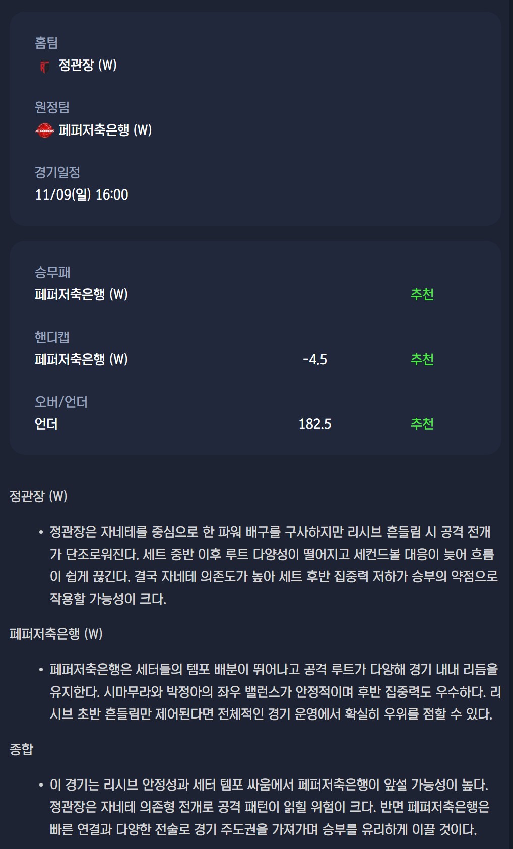 2025-11-09 정관장 vs 페퍼저축은행 여자배구 분석자료 스포츠 무료중계 / 스포츠 중계