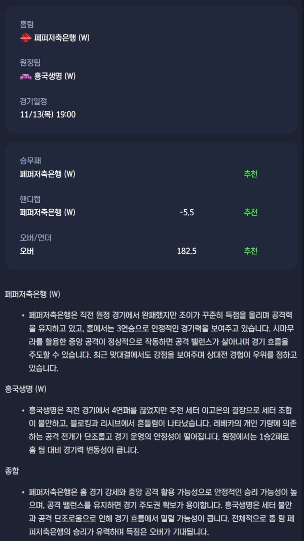 2025-11-13 페퍼저축은행 vs 흥국생명 여자배구 분석자료 스포츠 무료중계 / 스포츠 중계