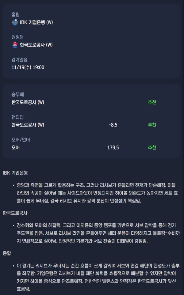 2025-11-19 IBK 기업은행 vs 한국도로공사 여자배구 분석자료 스포츠 무료중계 / 스포츠 중계