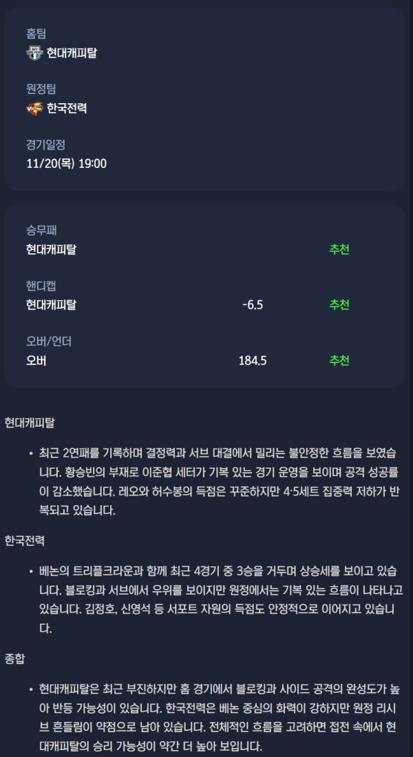 2025년 11월 20일 현대캐피탈 스카이워커스 배구단 한국전력 빅스톰 배구단 / 남자배구분석