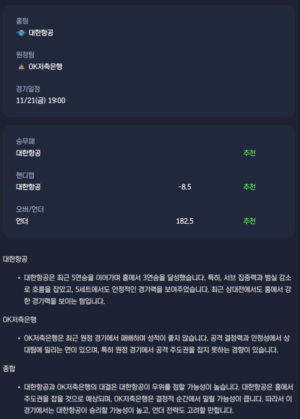 2025년 11월 21일 대한항공 점보스 배구단 OK저축은행 읏맨 배구단 / V리그 배구분석