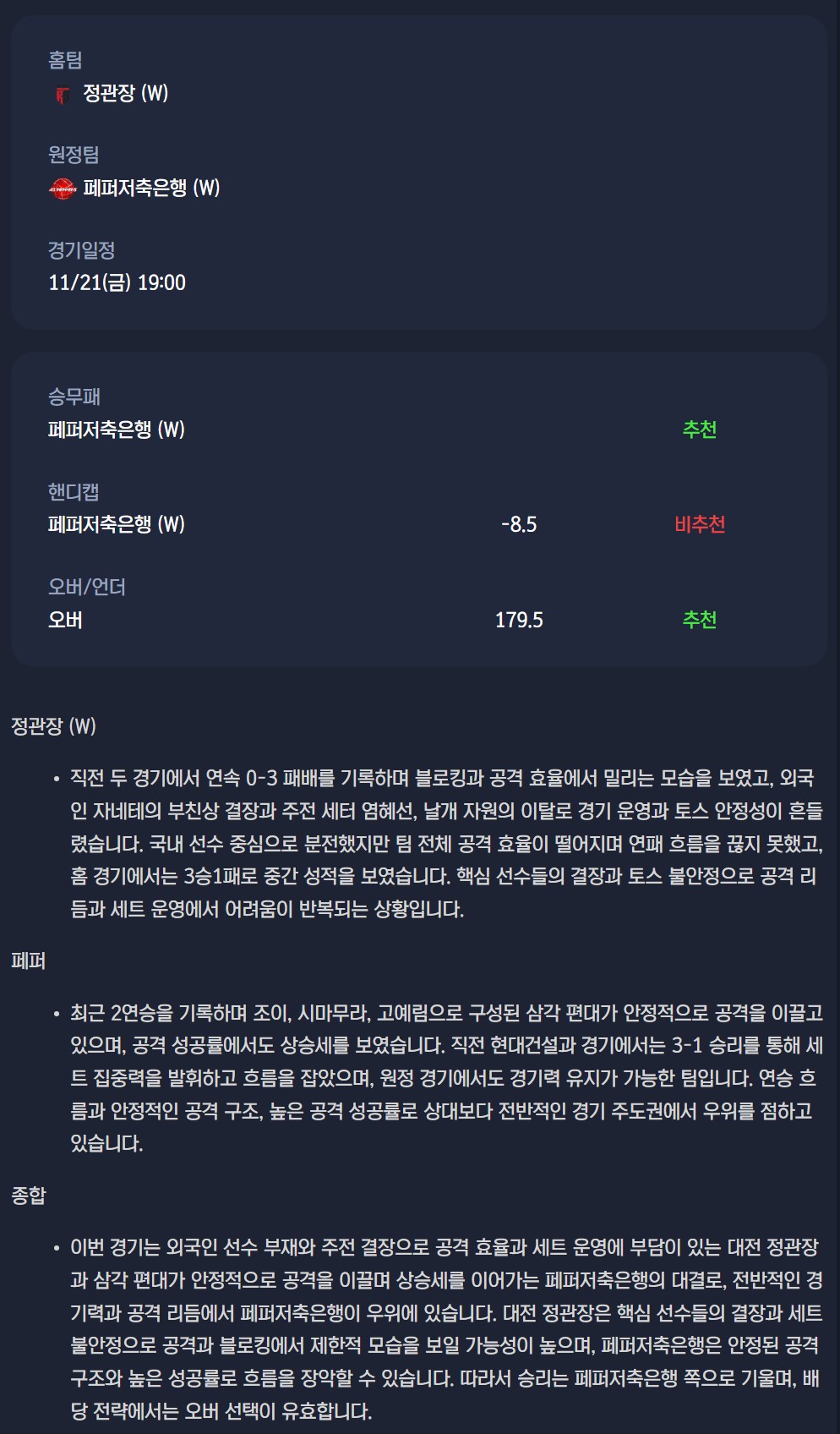 2025년 11월 21일 정관장 레드스파크스 페퍼저축은행 AI 페퍼스 배구단 / V리그 여자배구분석