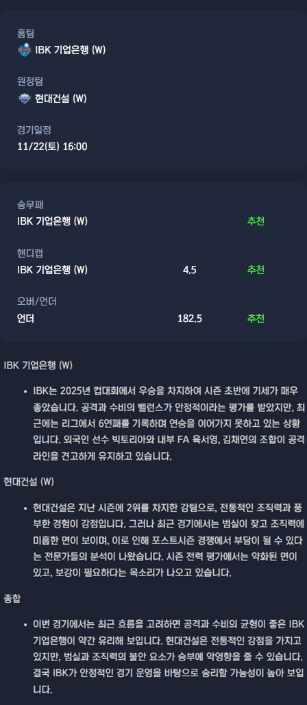 2025년 11월 22일 IBK기업은행 알토스 배구단 현대건설 힐스테이트 배구단 / V리그 여자배구분석
