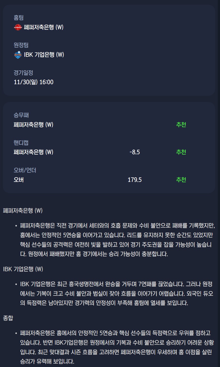2025년 11월 30일 페퍼저축은행 AI 페퍼스 배구단 IBK기업은행 알토스 배구단 / V리그 배구분석