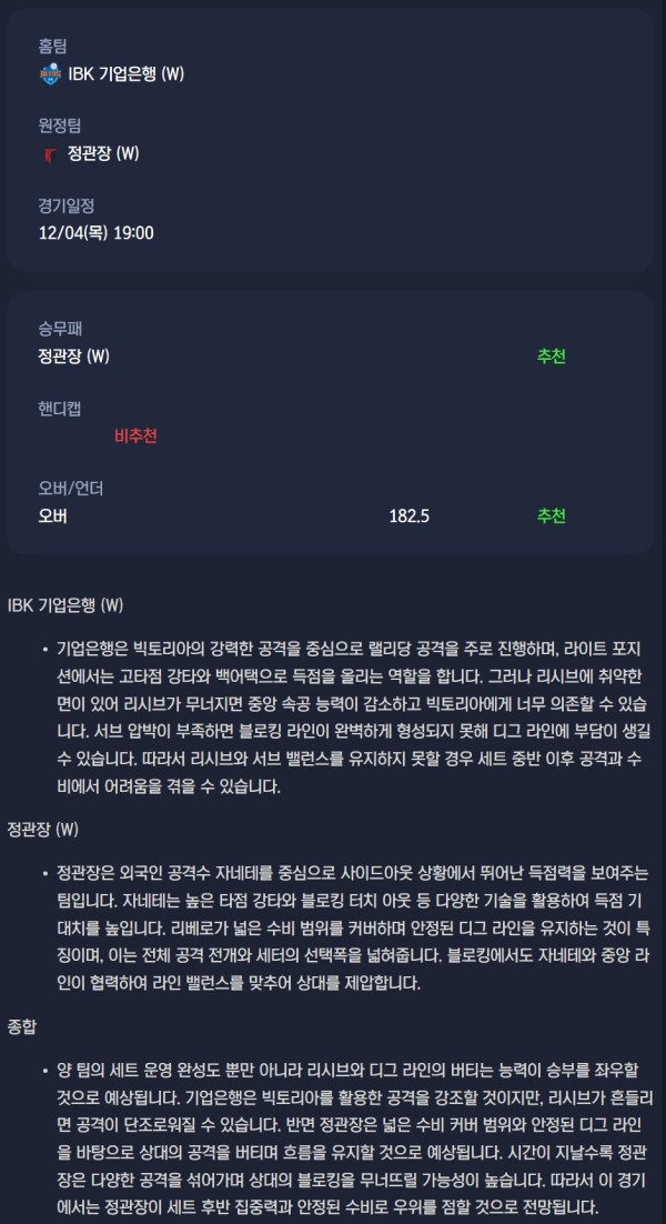 2025년 12월 04일 IBK기업은행 알토스 배구단 정관장 레드스파크스 / V리그여자배구분석