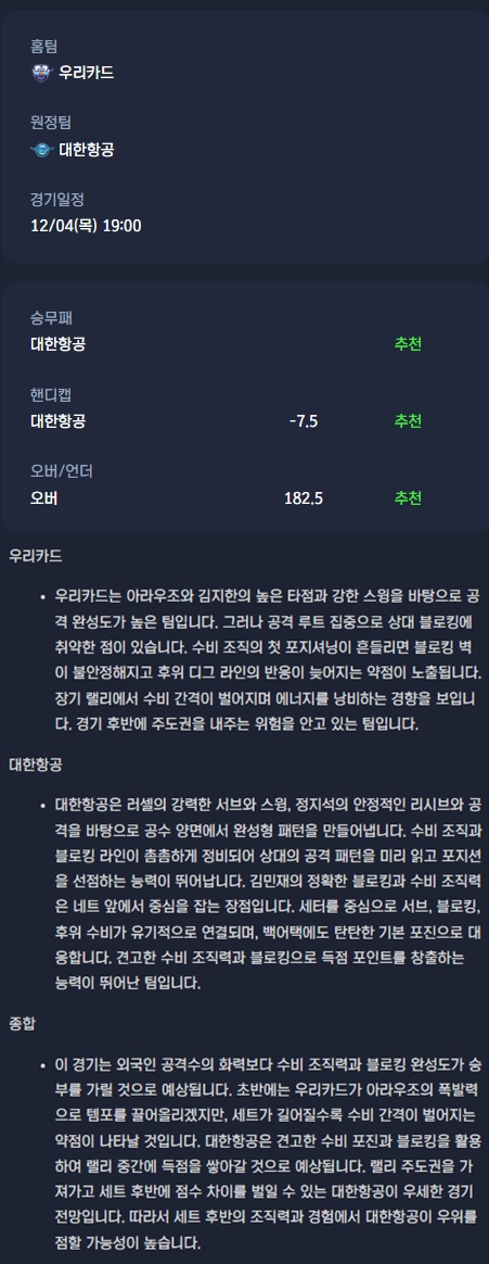 2025년 12월 04일 우리카드 우리WON 배구단 대한항공 점보스 배구단 / V리그남자배구분석