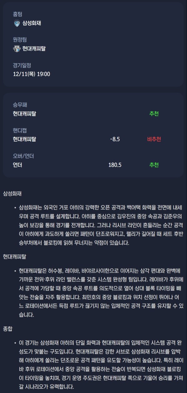 2025년 12월 11일 삼성화재 블루팡스 배구단 현대캐피탈 스카이워커스 배구단 / V리그 남자배구분석