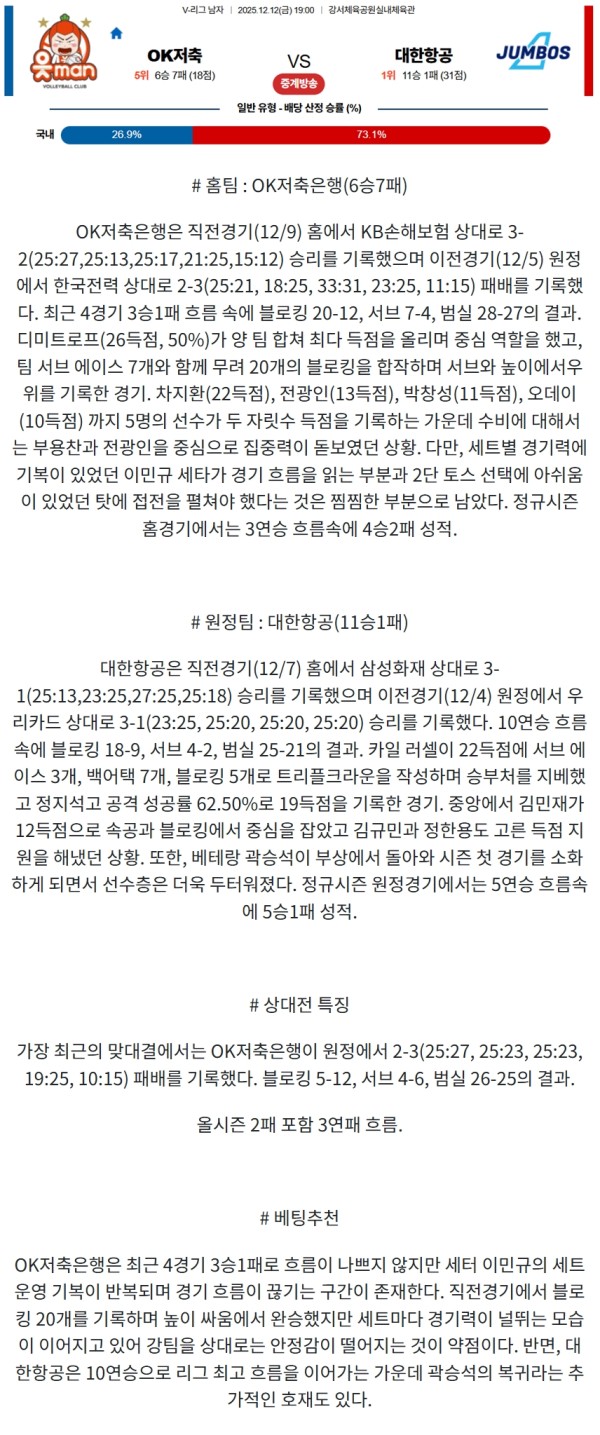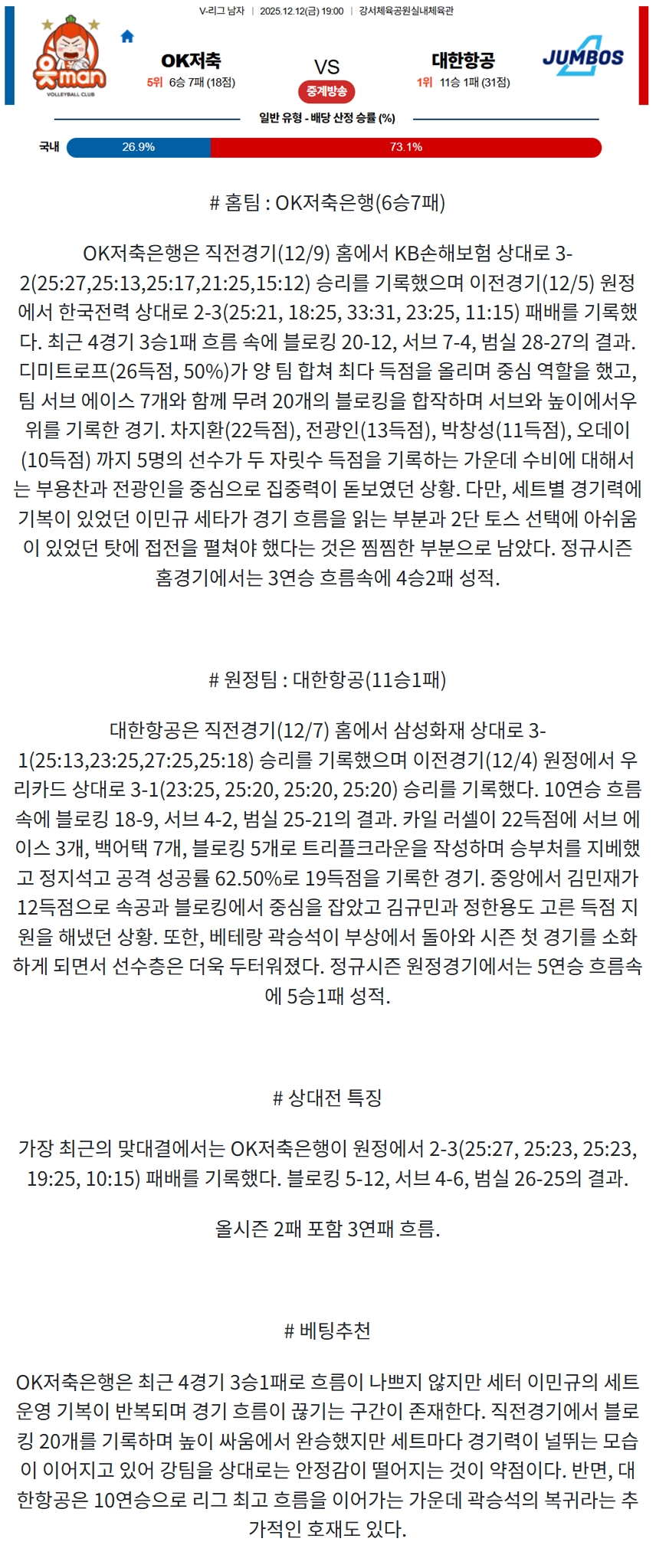2025년 12월 12일 OK저축은행 읏맨 배구단 대한항공 점보스 배구단 / V리그 남자배구분석