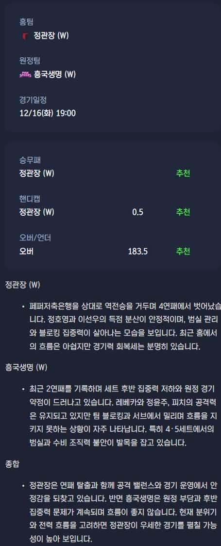 2025년 12월 16일 정관장 레드스파크스 흥국생명 핑크스파이더스 배구단 분석자료 / V리그 여자배구분석