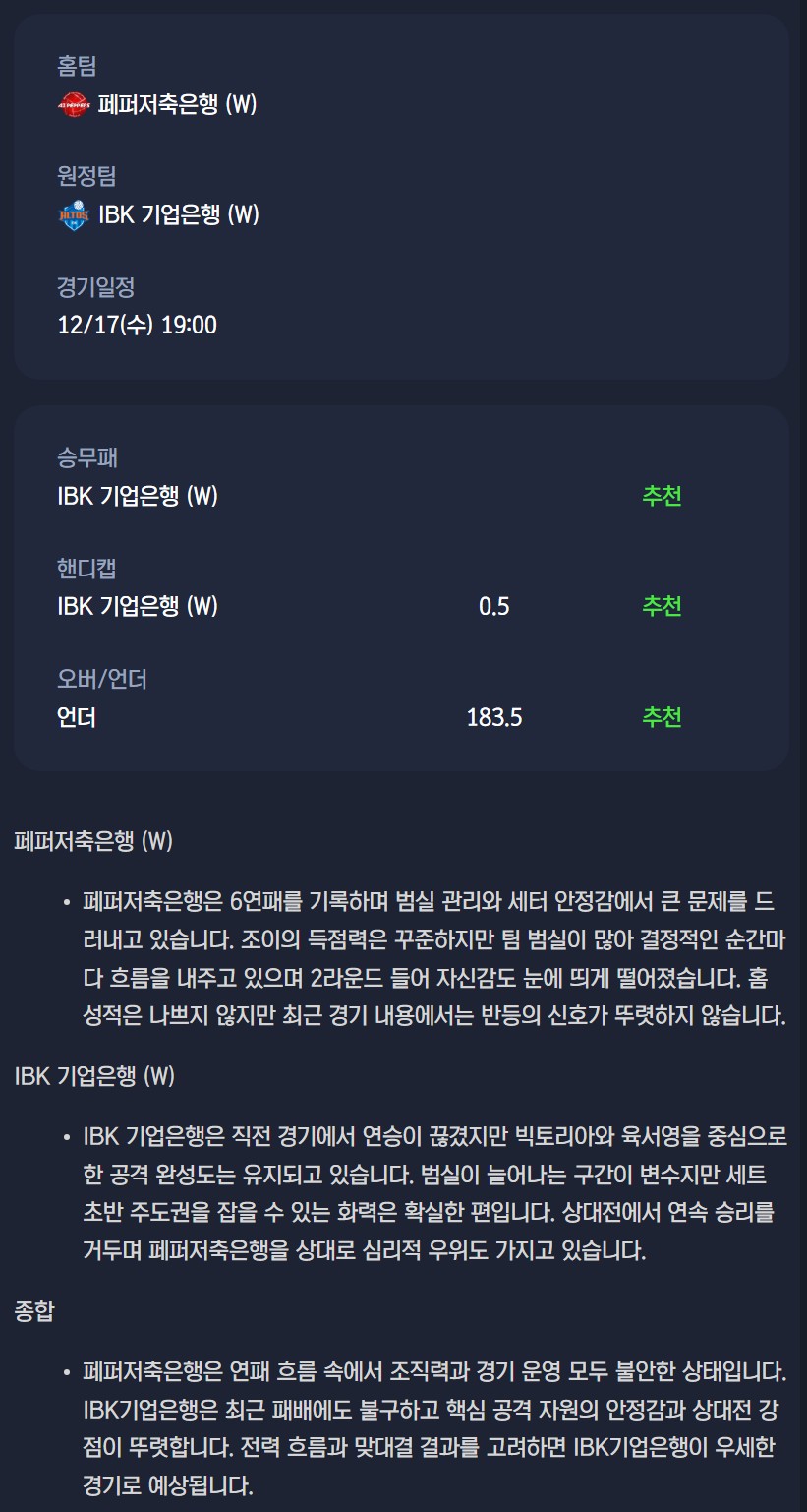 2025년 12월 17일 페퍼저축은행 AI 페퍼스 배구단 IBK기업은행 알토스 배구단 / V리그 여자배구분석