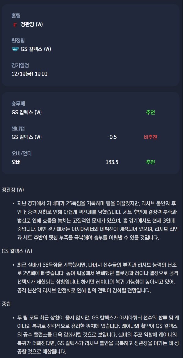 2025년 12월 19일 정관장 레드스파크스 GS칼텍스 KIXX 배구단 / V리그 여자배구분석