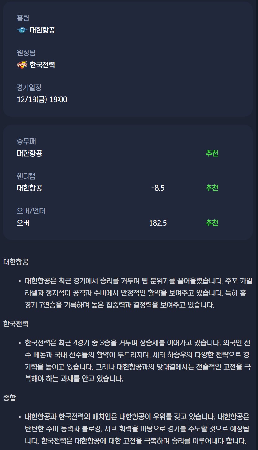 2025년 12월 19일 대한항공 점보스 배구단 한국전력 빅스톰 배구단 / V리그 남자배구분석