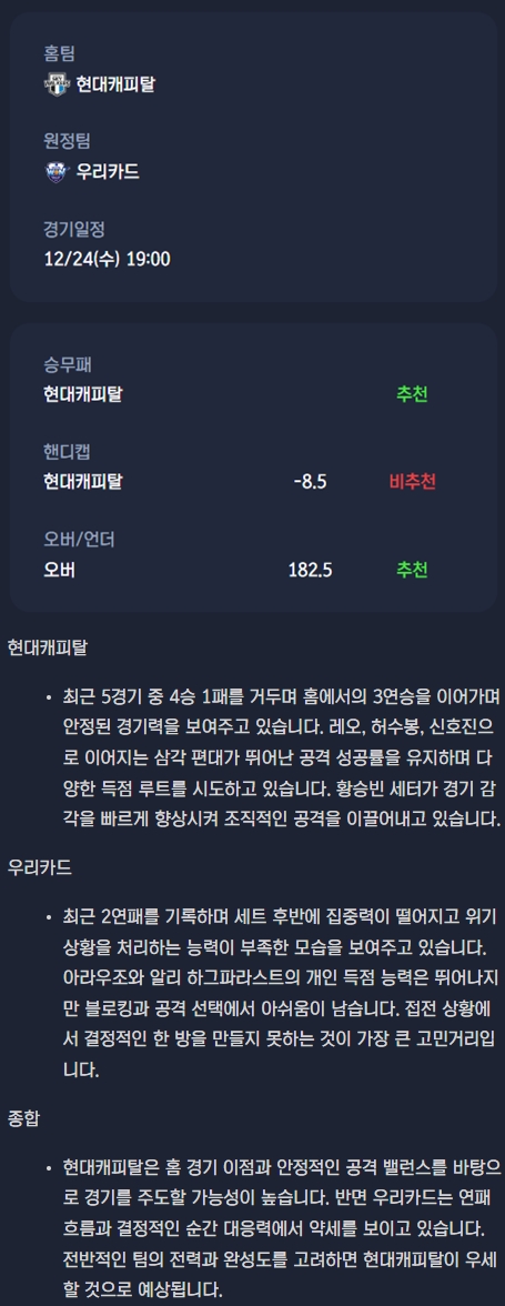2025년 12월 24일 현대캐피탈 스카이워커스 배구단 우리카드 우리WON 배구단 분석자료 / V리그 남자배…