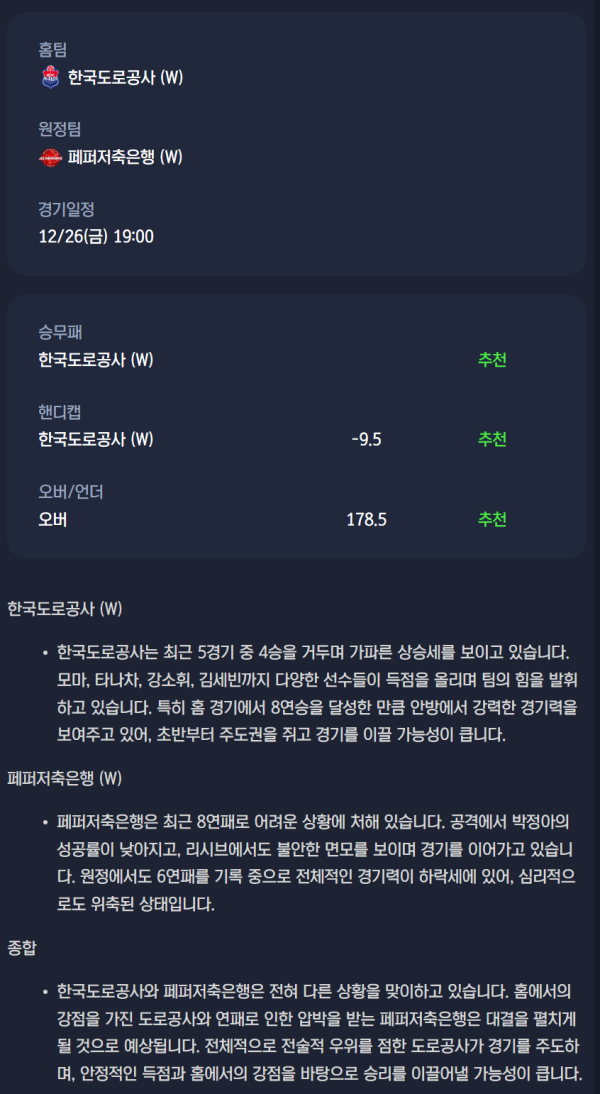 2025년 12월 26일 한국도로공사 하이패스 배구단 페퍼저축은행 AI 페퍼스 배구단 / V리그 여자배구분석