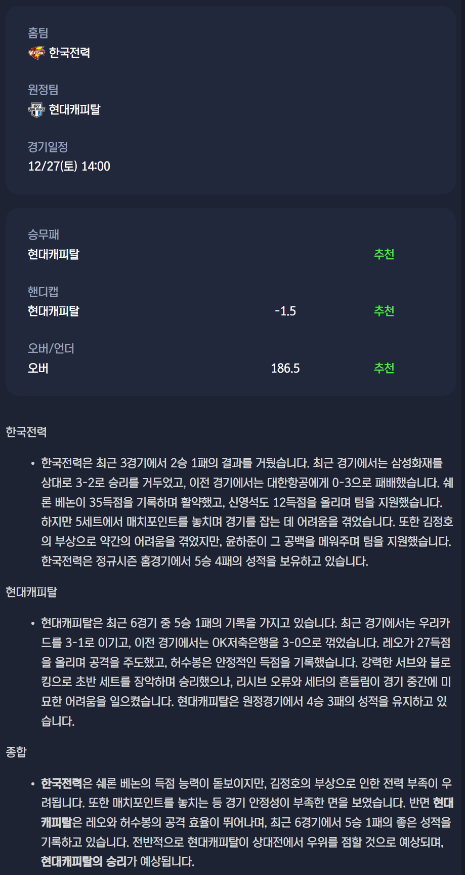 2025년 12월 27일 한국전력 빅스톰 배구단 현대캐피탈 스카이워커스 배구단 /V리그 남자배구분석