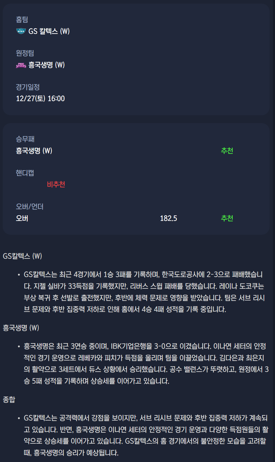 2025년 12월 27일 GS칼텍스 KIXX 배구단 흥국생명 핑크스파이더스 배구단 / V리그 여자배구분석