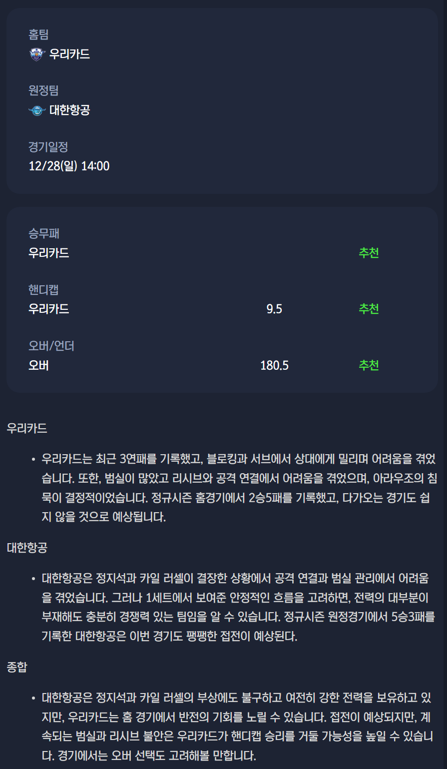 2025년 12월 28일 우리카드 우리WON 배구단 대한항공 점보스 배구단 / V리그 남자배구분석