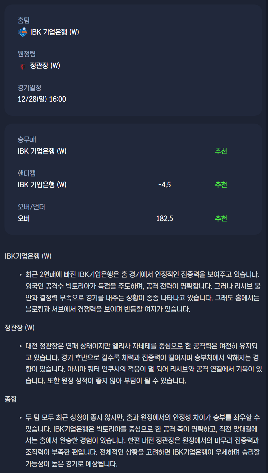 2025년 12월 28일 IBK기업은행 알토스 배구단 정관장 레드스파크스 / V리그 여자배구분석