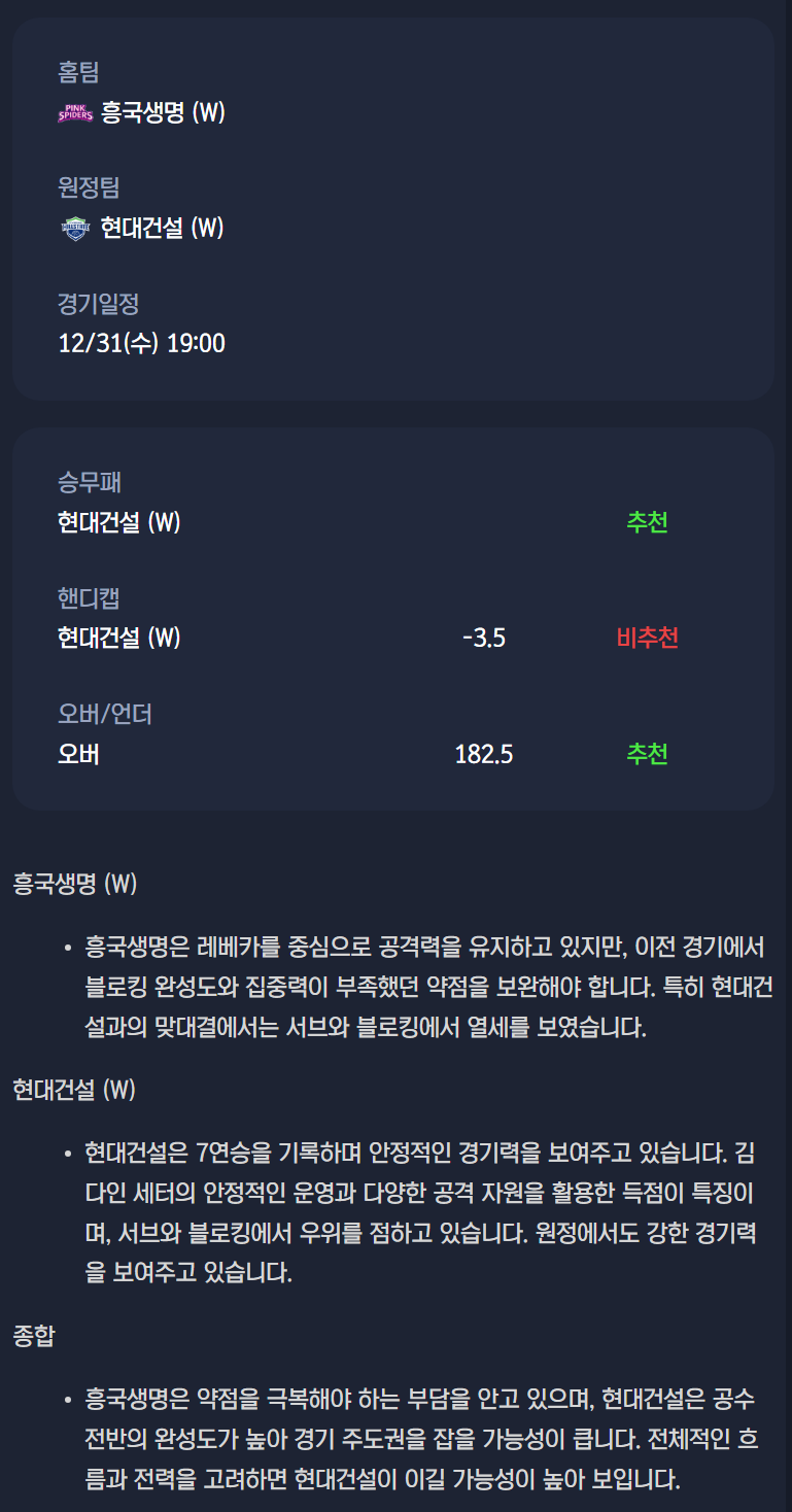 2025년 12월 31일 흥국생명 핑크스파이더스 배구단 현대건설 힐스테이트 배구단 / V리그 여자배구분석