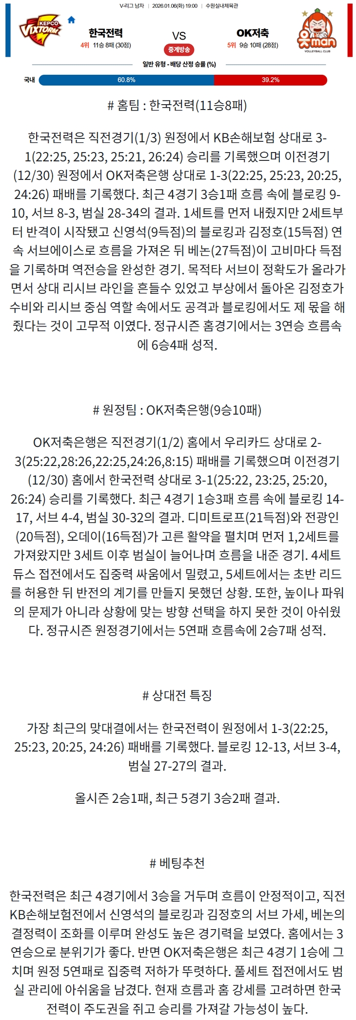 2026년 01월 06일 한국전력 빅스톰 배구단 OK저축은행 읏맨 배구단 / V리그 남자배구분석